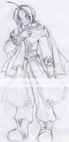 Believe me when I say drawing Ed in the army uniform is ALL THE RAGE out there. I mean, how come he doesn't wear it even though Roy is his boss? And are we sure they didn't have to special-order a bean-sized uniform for Ed?! XDDD *howls* Okay, maybe it's not all the rage, but almost every site I've seen has at least one picture like this. Note to self: next time, make the top longer and less flared at the bottom. Oh, shit, either make his right hand metal or with a glove. >_> (*only just realized...*)
